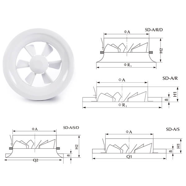 – With excellent performance, Swirl Ceiling Diffuser could be installed flatly with the ceiling or hung on construction objects, or on the air pipe inside of the enclosed ceiling.