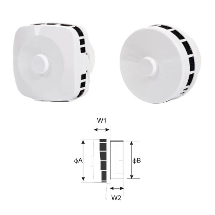 – Mounting: Fixing in the mounting frame, can also be used for direct mounting into the round duct (with or without a mounting frame).